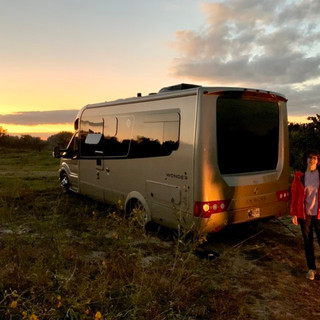 Our Harvest Host was Hilltop Grove near Weirsdale, southeast of Ocala. I'm sorry I'm not able to provide a link as I can no longer find them listed on HH. Maybe they withdrew from the program after our visit. Anyway, Hilltop comes under the farm category as it's an orange grove, and we simply set up camp between the rows of trees. A Canadian couple arrived earlier in the day and camped near the entrance to the property, but upon our late afternoon arrival, the manager directed us down a service road and gave us free run of the grove. We picked what looked level as we meandered the wide rows. With the soft, fertile soil, we didn't have the best options for tweaking the leveling process, but we made the best of our unique surroundings. Our traveling partners, with their automatic levelers, had an easier go of it, but still, the soft soil presented some limitations. Without levelers on our unit, we did our best to find the right incline and finally found a spot within reason. On the joy side, we were in the heart of the grove, far from any others, with clear skies above us.